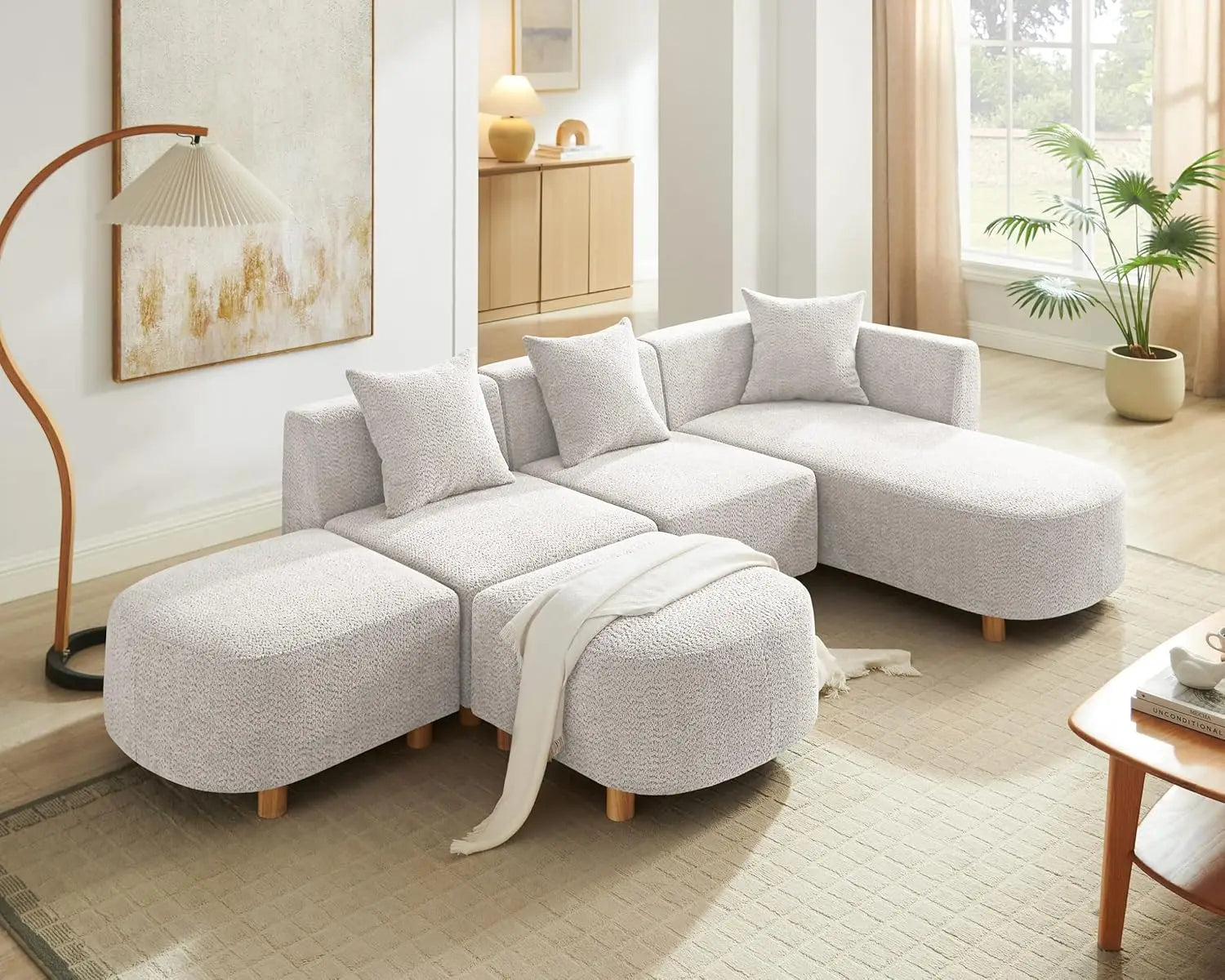 Rise above clutter with a 5-seater modular sofa that includes an ottoman for extra lounging and convenient storage. The modern sectional design offers back support and comfort for reading, coffee, or movie nights, while three included pillows add a touch of texture and resilience. With two deformation modes, you can reconfigure the layout to fit your room and activities, from a spacious lounge to a cozy conversation corner. Built for everyday use, it features a solid hardwood frame for durability and a stain-resistant boucle fabric that cleans easily. High-density elastic foam cushions provide lasting loft and comfort, so you can relax long after a busy day. This piece harmonizes with contemporary interiors and adapts as your space evolves.