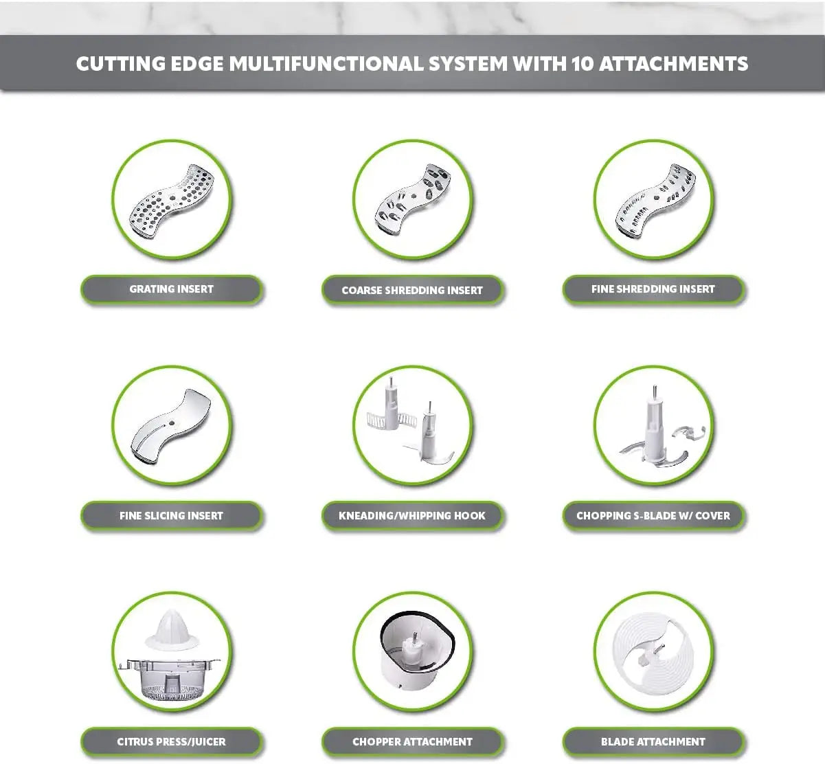 - 9 attachments included: You get blades and accessories to chop, slice, shred, whip, knead, and juice.