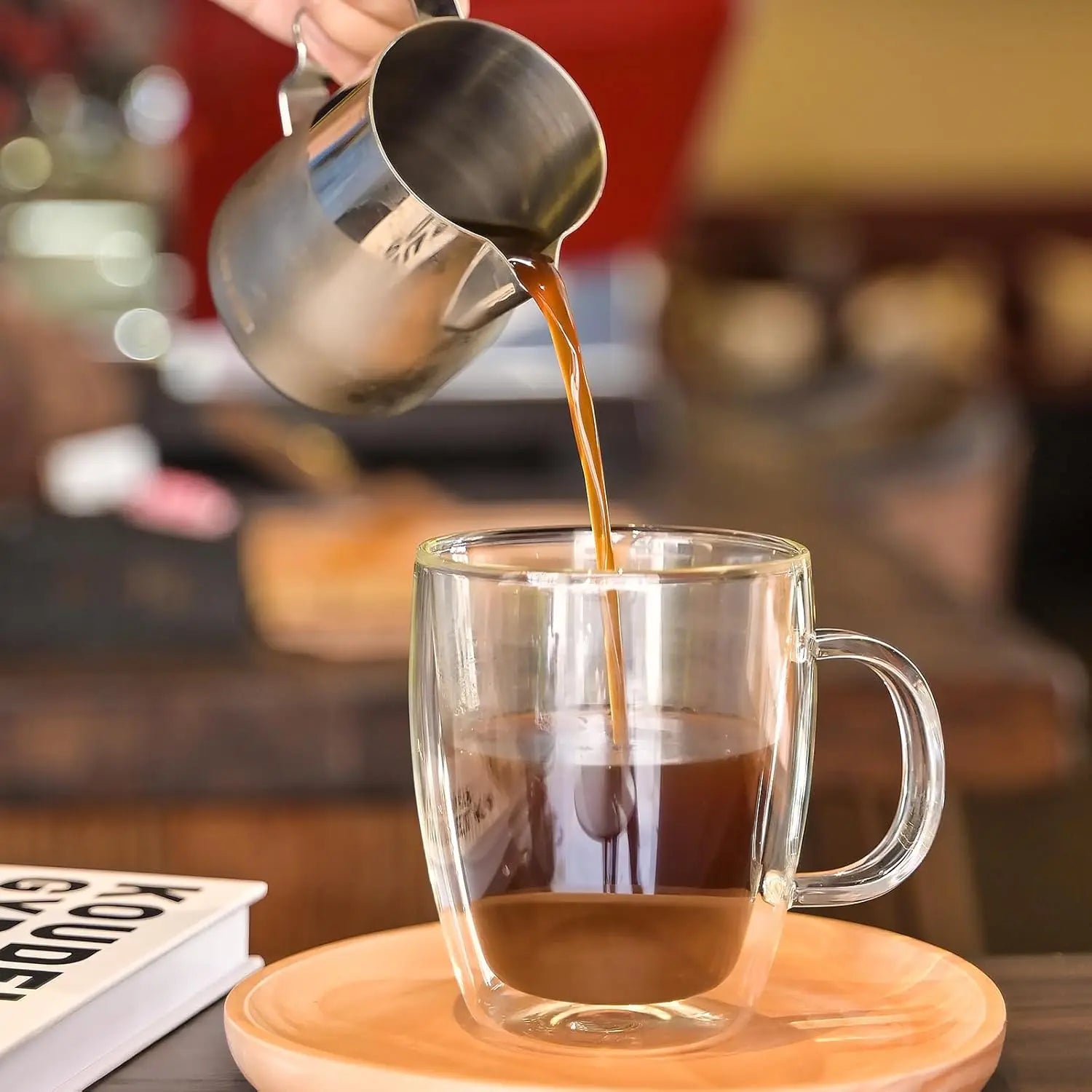 Keep your coffee at the perfect temperature while savoring every sip with this elegant 4-piece set of 12oz/350ml double-wall insulated glass cups.