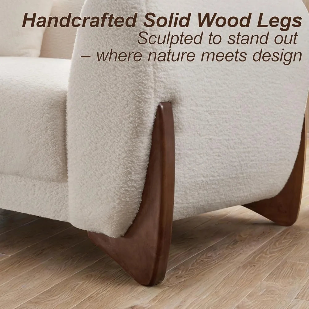 Experience cloud-like luxury with this modern U-shaped sofa. It features smooth rounded armrests, curved solid wood legs, and a wide U-configuration that invites relaxed lounging for families or gatherings. Wrapped in soft faux sherpa boucle with a crisp palette, it delivers plush, 8-inch-thick cushions that respond to every movement while the backrest eases body pressure. Built for daily life, the sturdy wood frame supports up to 950 pounds and maintains its shape with high-resilience foam. With generous dimensions (87"W x 34.5"D x 32"H) and a 25" seat depth (17.5" seat height), it fits three people comfortably. Three matching lumbar pillows add extra back support and style, while the assembly is straightforward and designed for simple setup.