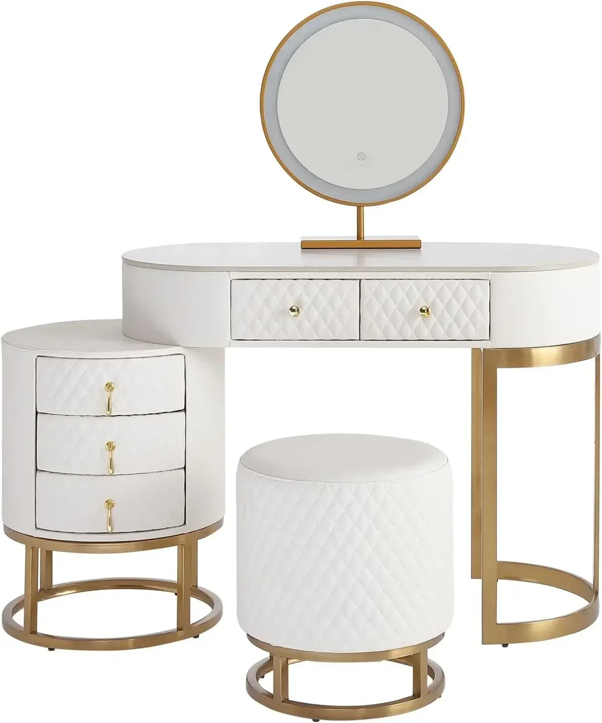 With its modern silhouette, this faux leather vanity desk set elevates your space as you get ready. The slate-textured tabletop sits on solid wood drawers with a durable PU leather surface for luxury and easy care. A stainless steel frame anchors the unit for lasting stability and a clean, contemporary look. The LED lighted mirror offers three color settings—cool white, warm white, and warm yellow—so you can achieve perfect lighting for every makeup routine. Five separate drawers help you organize skincare, cosmetics, jewelry, and tools, while a cushioned stool completes the set for comfortable styling. Dimensions: 39.37"W x 16.54"D x 29.92"H. Easy assembly means you can transform a plain corner into your personal beauty sanctuary quickly.