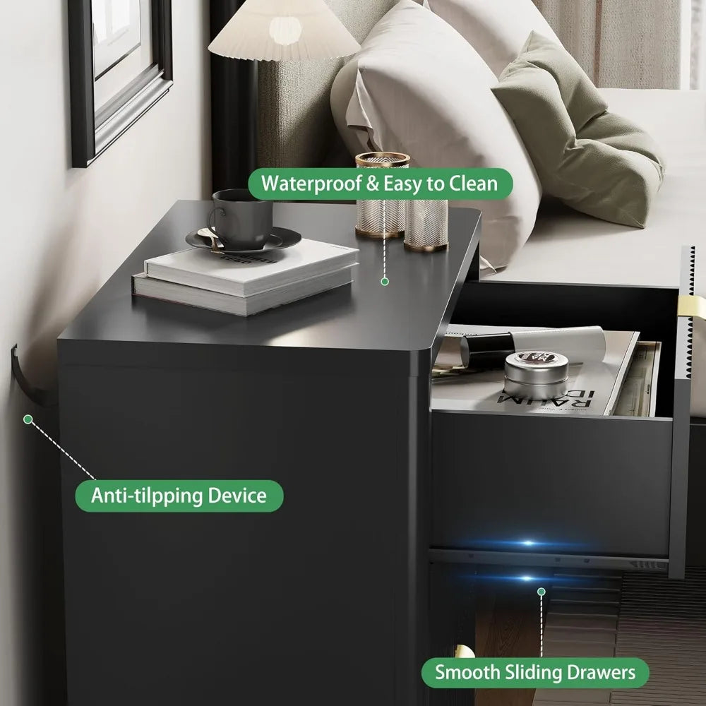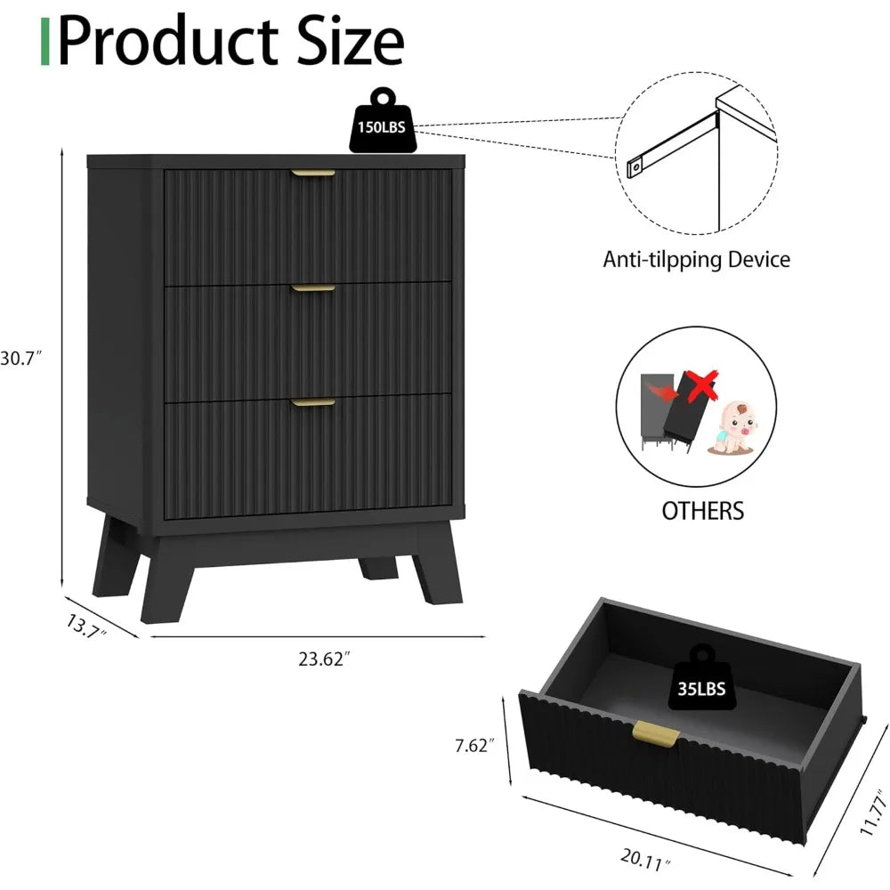 Add a touch of modern chic to your bedroom with a nightstand that features a wave-like fluted panel, creating texture and interest. The wide metal handle, splayed base legs, and smooth curved edges contribute a refined silhouette that feels stylish yet family-friendly. Crafted from engineered wood with a sleek black finish, this bedside table delivers dependable durability while maintaining a light, airy presence. You get three deep drawers to hide essentials, and a roomy top surface ideal for a lamp, photo frames, or a small plant. With a top capacity of up to 75 lbs and 35 lbs per drawer, it stays sturdy with daily use. An anti-tipping device adds stability, helping keep your space secure.