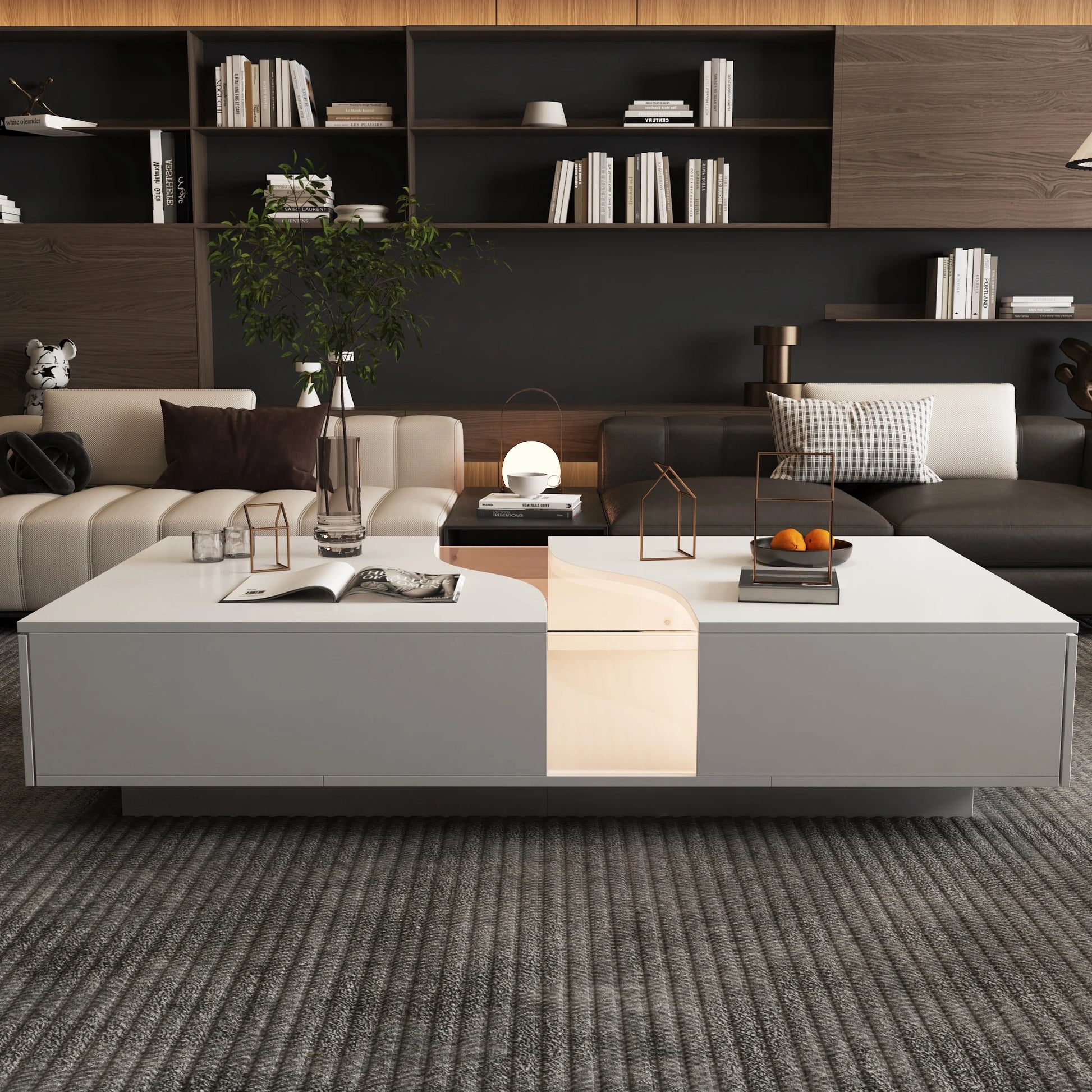 Elevate your living room with a 55.1'' wide modern coffee table that combines expansive surface, hidden storage, and mood lighting.