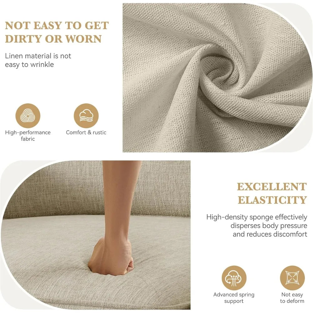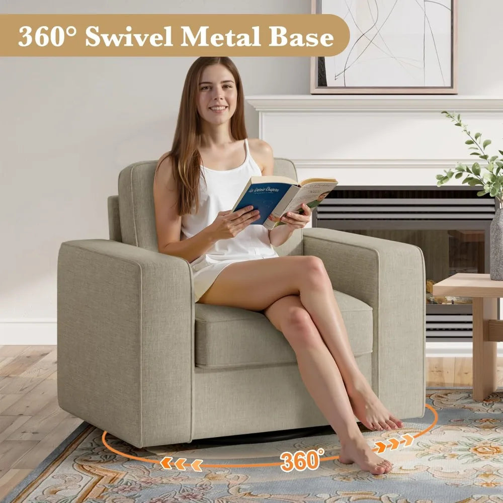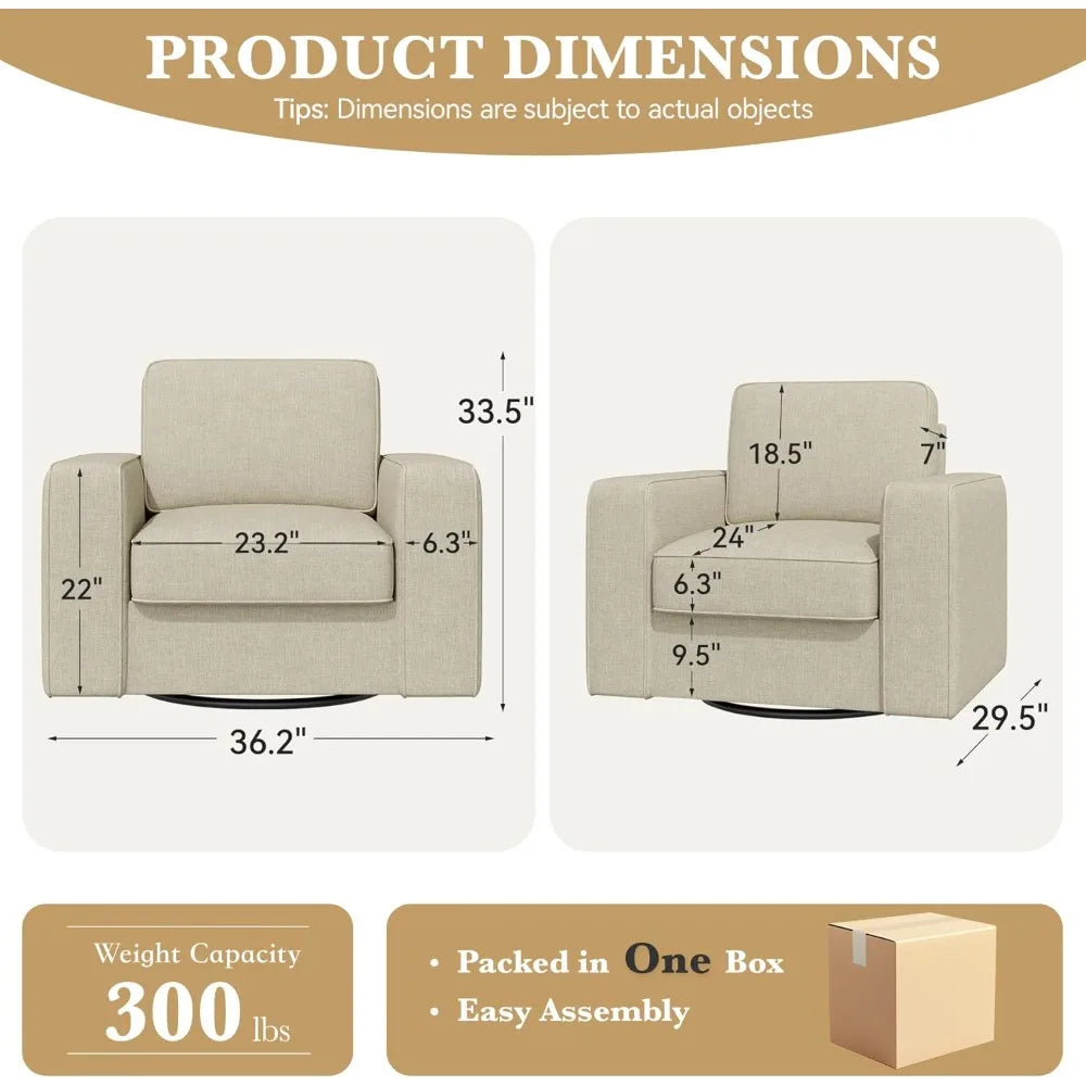 Designed for versatile placement, this beige linen swivel armchair brings a refined silhouette to living rooms, bedrooms, apartments, or offices. Its 360-degree swivel base lets you turn with ease to watch TV, chat with guests, or work from any angle, while the FSC-certified wood frame provides lasting durability. The mid-century modern style adds a touch of sophistication, and the skin-friendly linen upholstery delivers a smooth, luxurious feel. An ergonomic backrest supports proper posture, reducing strain during long reads or conversations. Built with a high-density foam seat (28D) and built-in springs, the chair maintains comfort and shape over time. Care is simple—remove the seat cushion and backrest for easy cleaning, helping your space stay fresh.